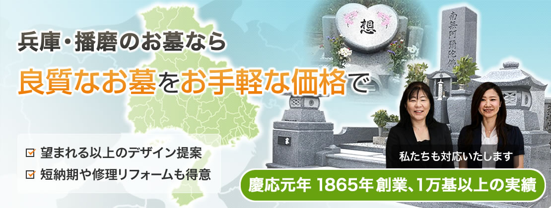 江戸慶応元年から、兵庫・播磨のお墓・石材専門として、皆様にご支持をいただいてまいりました。 これからも、皆様に喜んでいただけますように、ご要望に最も応えられるお店を目指し、下記の6つのお約束をいたします。