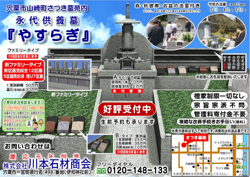 宍粟市山崎町さつき墓苑内にございます永代供養墓「やすらぎ」は、合祀墓の他、33回忌まで個別安置の個別墓、ファミリータイプがございます。春・秋のお彼岸とお盆には合同法要が行われます。