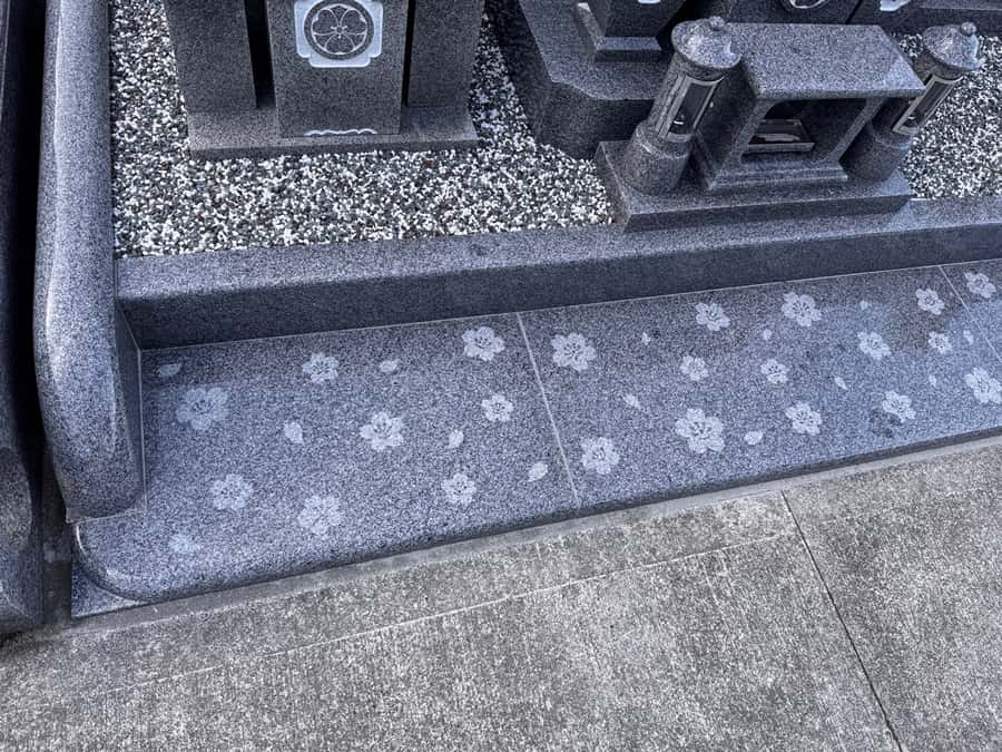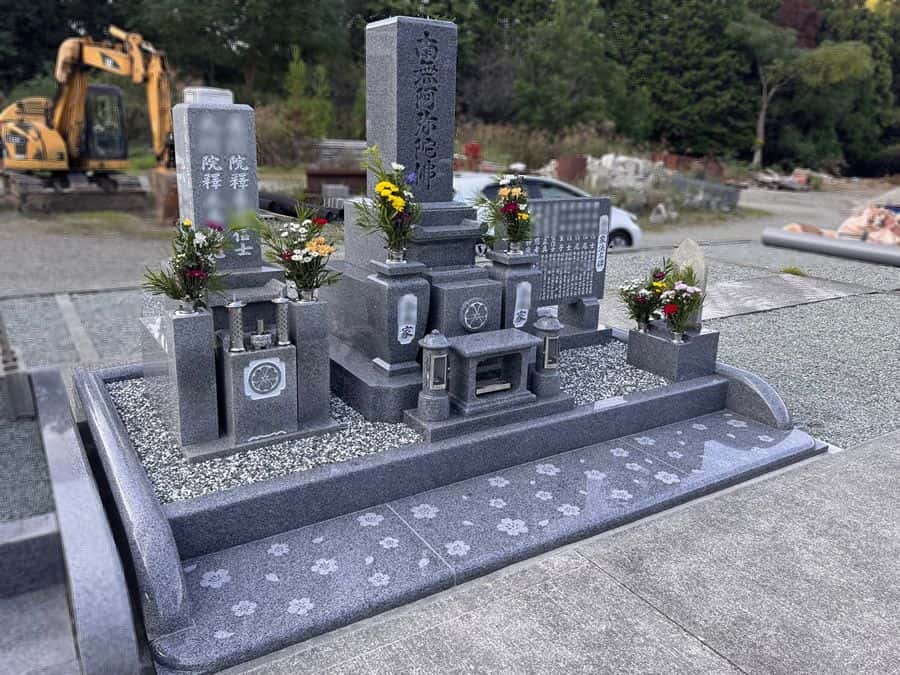 山の中のお墓をお参りしやすい墓地に移設する際に、先祖墓と法名碑を新しく作られました。巻き石はお参りしやすいバリアフリー型、拝み石にはノンスリップ加工の桜の花びらを彫刻させて頂きました。(石種:K12)
