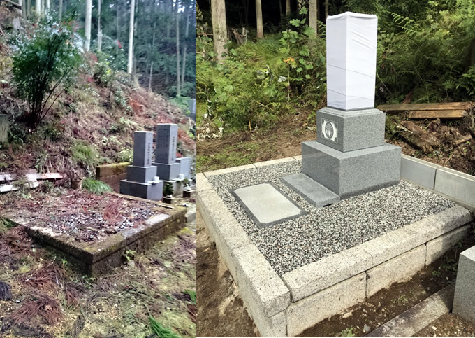 ご主人が亡くなられて、墓地の改修を考えられていたのですが、お墓もけっこう傷んでおり費用も掛かりそうだったので、「それならお墓をやり直されては」と、ご提案させて頂きました。予算の範囲内でできるのであれば・・・ということで、お墓を新調させて頂きました。「すごくきれいになった」と、とても喜んでいただきました。